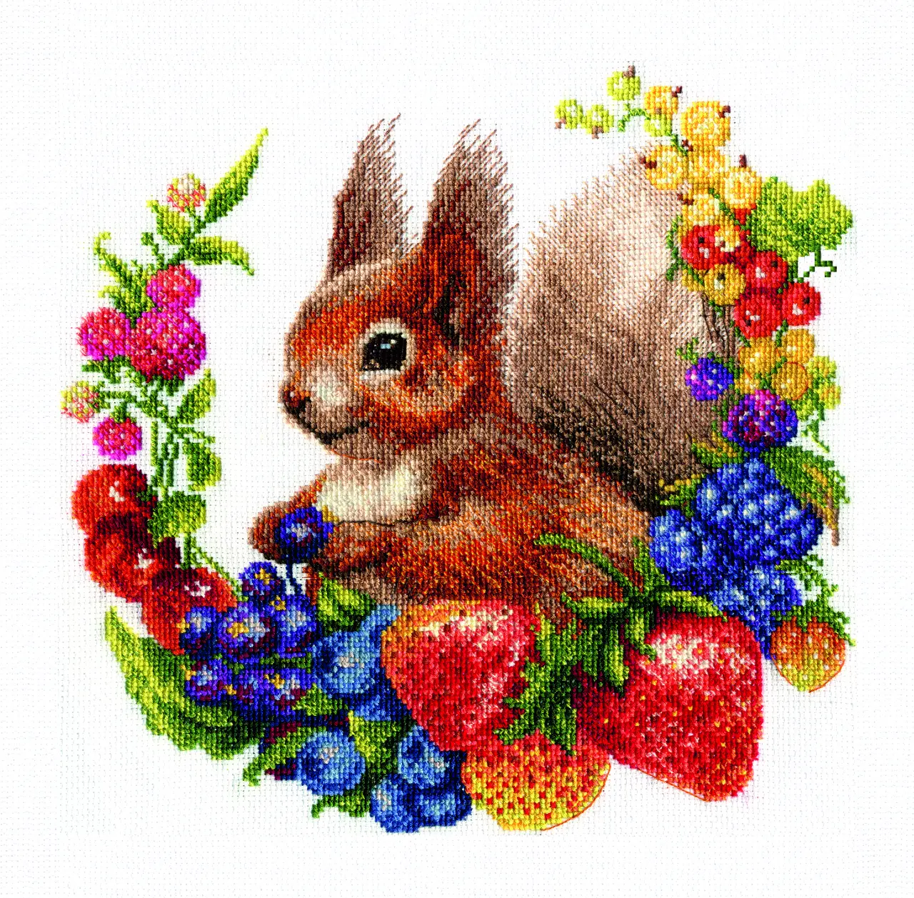 At the heart of the design is an adorable squirrel with a gentle, friendly expression, adorned with a delicate wreath made of berries and fruits. Her fluffy reddish tail and playful character come to life stitch by stitch, creating a warm, fairy-tale atmosphere. This charming artwork will make a lovely interior decoration or a heartfelt gift for nature lovers and handmade enthusiasts.