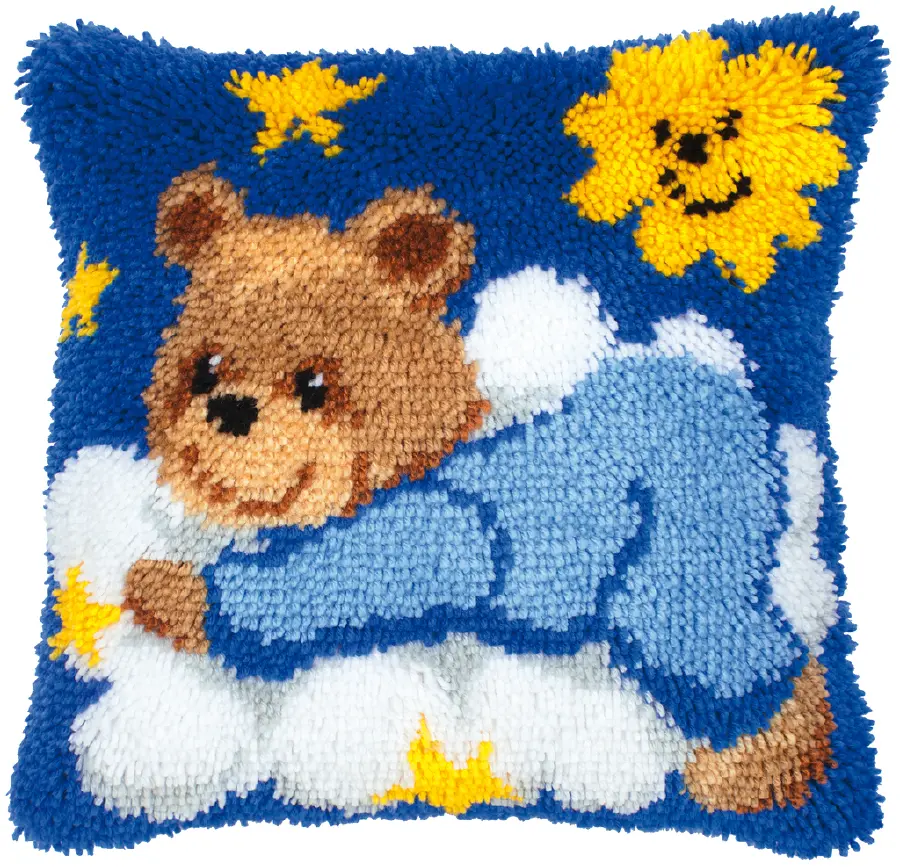 Kit includes: instructions, printed stramine (52% cotton, 48% polyester), acrylic thread and crochet hook.