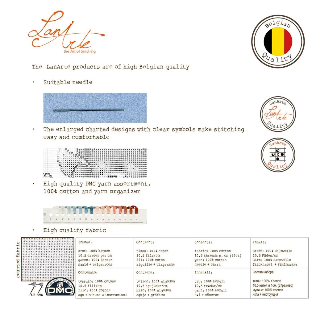 A set for cross-stitching with a scheme. The set includes: fabric for embroidery: 100% cotton, uniform size 27 (107 cells in 10 cm). mouliné: 100% DMC cotton, yarn organizer, needle instructions. The size of the finished work: 39 x 51 cm.