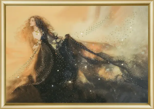 The kit contains: instruction chart, glass polystyrene with image, Preciosa Flat Back stones, glue, applicator for installation of Flat Back Stones, and frame (the frame in the kit may be different from the frame specified on the image).